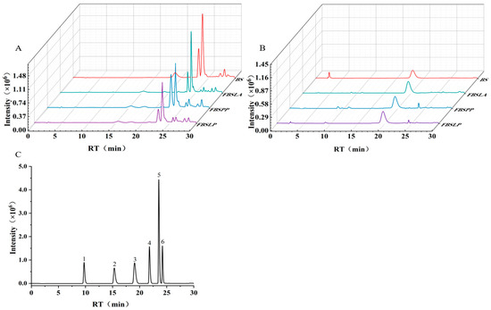 Using unfermented bamboo shoots BS as a control, the changes in the content of bound and free phenols contained in bamboo shoots during fermentation by different lactic acid bacteria are shown in Figure 1. The polyphenols in bamboo shoots were dominated by bound phenols. In the first 6 d of fermentation, compared with BS, the content of bound phenols in FBSLA, FBSPP, and FBSLP gradually decreased with the increase in fermentation time, while on the contrary, the content of free phenols gradually increased. From 6 d to 10 d of fermentation, both bound and free phenol contents of the three bamboo shoots decreased slowly with increasing time. From 10 d to 16 d, the contents of bound and free phenols in the three bamboo shoots gradually stabilized. This may be due to the rapid multiplication and vigorous metabolism of LAB in the first 6 d of fermentation, and the various enzymes and total acids produced by the fermentation contributed to the release of bound phenols, which are tightly bound to the plant cell wall, into free phenols [19]. The conversion of polyphenol release into free phenols was most pronounced on the 6th day of fermentation, so the sample from the 6th day was selected for subsequent experiments to explore the reasons for the changes in polyphenols due to LAB fermentation. At this time, the bound polyphenol content of FBSLA, FBSPP, and FBSLP was 1.91, 2.18, and 1.93 mg GAE/g DW, and the free polyphenol content was 1.12, 1.48, and 1.20 mg GAE/g DW, respectively. The ability of LAB fermentation to significantly increase the content of free polyphenols has also been confirmed in previous studies [20]. At the same time, free phenol properties are also unstable and susceptible to oxidative damage, so the free phenol content decreases in the later stages of fermentation.