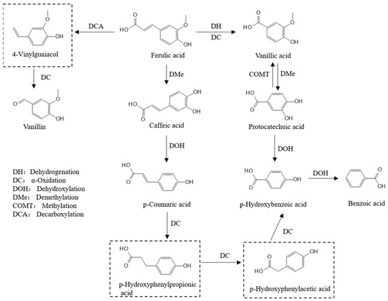Based on Table 1, it can be deduced that bamboo shoots undergo biotransformation between their polyphenol fractions after fermentation by LAB. The transformation between polyphenols may occur through various pathways under the action of hydrolytic enzymes produced by microorganisms. The release of ferulic acid contained in bamboo shoots from the bound state to the free state after fermentation by LAB, but the two quantities were not equal, suggesting that ferulic acid may have undergone biotransformation. By searching the related literature, it was hypothesized that ferulic acid might be transformed through the pathways of benzoic acid and hydroxycinnamic acid [22,23], as shown in Figure 3. Ferulic acid can be converted to vanillin through decarboxylation and α-oxidation [24] and to vanillic acid through dehydrogenation and α-oxidation [25].