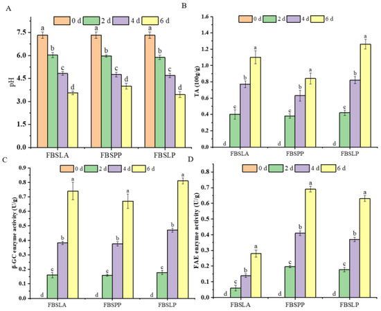 Changes in (A) pH, (B) TA, (C) β-GC enzyme activity, and (D) FAE enzyme activity in bamboo shoots prepared by LAB fermentation for 6 days. Different letters indicate significant differences in pH value, TA, and enzyme activity content for the same sample at different fermentation times, p < 0.05.