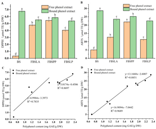 The results of the DPPH and ABTS radical scavenging capacities of free and bound phenol extracts from bamboo shoots prepared by LAB for 6 d, and their correlation with the contents of free and bound polyphenols are shown in Figure 6. As can be seen from Figure 6A,B, the DPPH and ABTS radical scavenging capacities of the extracts of the four samples showed the same trend, with the DPPH and ABTS radical scavenging capacities of the free phenol extracts being, in descending order, FBSPP, FBSLA, FBSLP, and BS, and those of the bound polyphenols being, in descending order, BS, FBSPP, FBSLA, and FBSLP. This is consistent with the changes in the release of bound phenols into free phenols shown in Table 1. Similar observations were also reported when studying the effects of LAB fermentation on changes in phenolic compounds and antioxidant capacity of edible fungi [18].