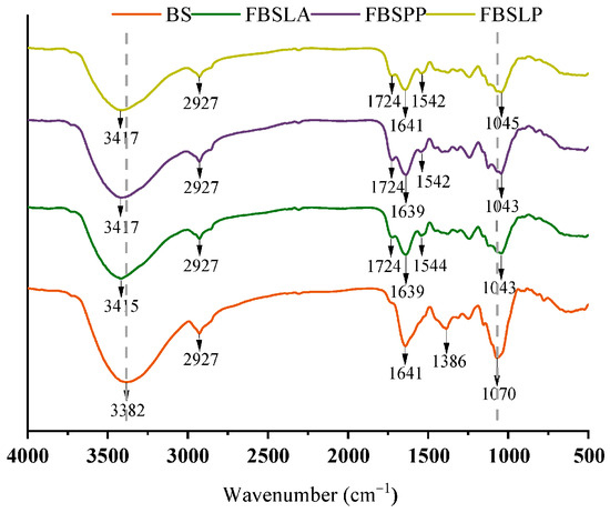 FTIR spectroscopy provides detailed information on the characteristics of chemical or biochemical substances present in a sample by analyzing the molecular vibrations of functional groups, including the stretching, bending, and twisting of chemical bonds. The FTIR spectra of bamboo shoots before and after fermentation by LAB are shown in Figure 7.