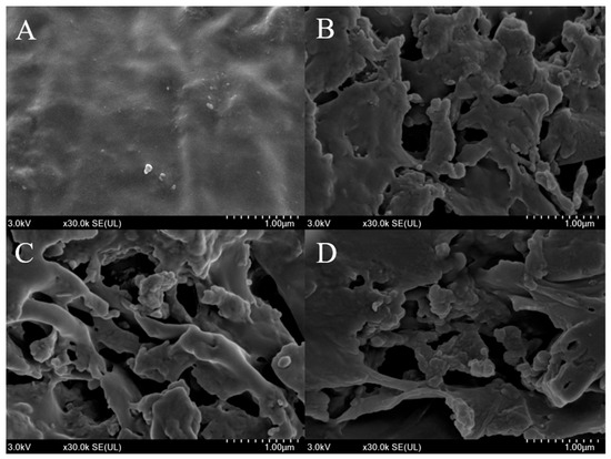 SEM of bamboo shoot samples before and after LAB fermentation: (A) BS; (B) FBSLA; (C) FBSPP; (D) FBSLP.