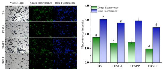 As can be seen from Figure 9, the green and blue fluorescence intensities of FBALA, FBSPP, and FBSLP were significantly weakened (p < 0.05) when obtained at 6 d of fermentation compared with BS. Among the three LAB fermented bamboo shoots, the green and blue fluorescence intensities were strongest for FBSPP, followed by FBSLA, and weakest for FBSLP. A significant correlation between fluorescence intensity and polyphenol content has been demonstrated [42]. The changes in green fluorescence and blue fluorescence intensity in Figure 9 were consistent with the changes in bound polyphenol content in Table 1. This suggests that the bound polyphenols were partially released from bamboo shoots after fermentation by LAB.