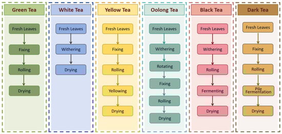 Teas are commonly classified into six main categories: green tea, white tea, yellow tea, oolong tea, black tea, and dark tea, based on their distinct processing methods, chemical composition, and sensory characteristics (Figure 1).