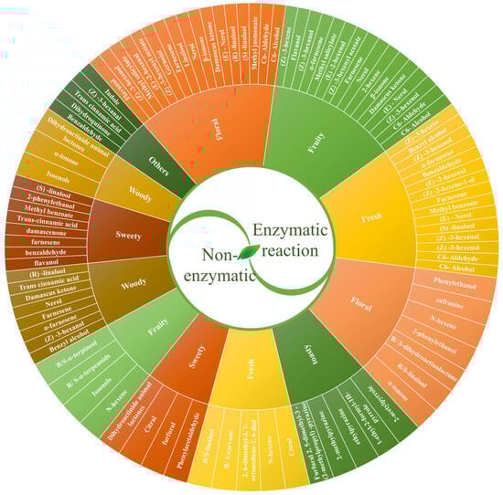 An aroma wheel is formed under enzymatic and non-enzymatic reactions. Note: Enzymatic and non-enzymatic reactions are two crucial processes in the formation of tea aroma. This figure illustrates the sensory aromas and their corresponding VOCs generated by these two types of reactions.