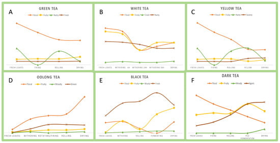 The changing trend of the aroma of six kinds of tea in different processing. Note: To investigate the variation trends of aroma compounds during the processing of the six major tea categories, this study selected a key representative compound for each aroma type. The content data of these compounds at different processing stages were obtained through a literature review, and the variation trend graphs were drawn accordingly. Each aroma type and its corresponding key compound are listed in the following text. (A) Floral—Linalool, Fruity—Heptanal, Nutty—Benzaldehyde, Fresh—Benzaldehyde [18,19]. (B) Floral—Linalyl acetate, Fruity—Phenylacetaldehyde, Fresh—(Z)-3-Hexen-1-ol, Nutty—Benzyl [20]. (C) Floral—Linalool, Fruity—Heptanal, Nutty—Benzaldehyde, Fresh—Benzaldehyde [18,21]. (D) Floral—Linalool, Fruity—Citral, Woody—Pinene, Green—3-Hexen-1-ol [22]. (E) Floral—Linalool, Fruity—Phenylacetaldehyde, Woody—Trans-linalool oxide (furanoid), Fresh—Methyl salicylate [23]. (F) Floral—Linalool, Fruity—Aldehydes, Woody—Guaiene, Agaric—1,2,3-Trimethoxybenzene [24].