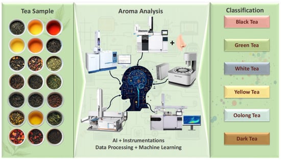 As one of the most ancient and widely consumed beverages globally, tea holds profound cultural significance and immense commercial importance. Botanically, it is defined as a processed product derived from the fresh leaves of Camellia sinensis [Camellia sinensis (L.) O. Kuntze] or Camellia assamica [Camellia sinensis var. assamica (Mast.) Kitamura]. Tea quality is determined by multiple factors, including plant genetics, agroecological conditions, picking standards, and postharvest processing [1,2,3]. The aromatic profile of tea, which serves as a critical quality indicator, provides an objective basis for evaluating product grades and processing precision. Furthermore, the aromatic profile of tea determines its olfactory characteristics, which play a decisive role in shaping consumer preferences [4]. However, the compounds and their composition in tea aroma are complex remaining to be revealed. Therefore, systematically identifying and accurately classifying VOCs and understanding their biosynthesis pathways are essential to tea science research. And it is a significant implication for enhancing quality control and guiding market-driven product development.
