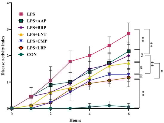 Figure 1 indicates that, at 1 hour post-induction, DAI values in LPS+LNT, LPS+LBP, and LPS+CMP groups showed no statistical divergence from CON controls. By 6 h, all polysaccharide-treated cohorts manifested significantly reduced DAI scores versus the LPS group (p < 0.01). Among interventions, LPS+LBP demonstrated lower DAI than LPS+LNT (p < 0.05). Furthermore, LPS+LBP and LPS+CMP groups exhibited decreased DAI relative to LPS+BRP and LPS+AAP groups (p < 0.01).