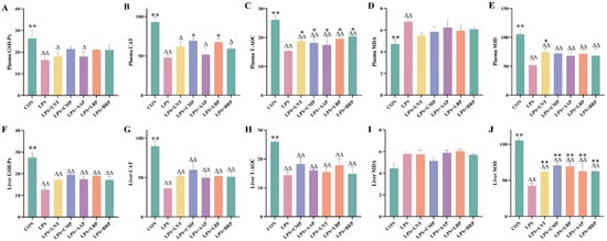 Effects of polysaccharides on antioxidant indicators (n = 6). (A) Plasma GSH-Px, (B) Plasma CAT, (C) Plasma T-AOC, (D) Plasma MDA, (E) Plasma SOD, (F) Liver GSH-Px, (G) Liver CAT, (H) Liver T-AOC, (I) Liver MDA, and (J) Liver SOD. ∆ p < 0.05, ∆∆ p < 0.01, relative to the CON group. * p < 0.05, ** p < 0.01, relative to the LPS group.