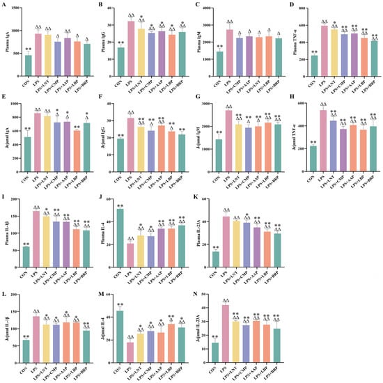 Effects of polysaccharides on immune indicators. (n = 6). (A) Plasma IgA, (B) Plasma IgA, (C) Plasma IgM, (D) Plasma TNF-α, (E) Jejunal IgA, (F) Jejunal IgA, (G) Jejunal IgM, (H) Jejunal TNF-α, (I) Plasma IL-1β, (J) Plasma IL-4, (K) Plasma IL-23A, (L) Jejunal IL-1β, (M) Jejunal IL-4, and (N) Jejunal IL-23A.∆ p < 0.05, ∆∆ p < 0.01, relative to the CON group. * p < 0.05, ** p < 0.01, relative to the LPS group.
