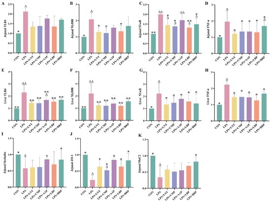Effect of polysaccharides on the expression of immune and intestinal barrier-related genes (n = 6). (A) Jejunal TLR4, (B) Jejunal MyD88, (C) Jejunal Nf-κB, (D) Jejunal TNF-α, (E) Liver TLR4, (F) Liver MyD88, (G) Liver Nf-κB, (H) Liver TNF-α, (I) Jejunal Occludin, (J) Jejunal ZO-1, and (K) Jejunal MuC2. ∆ p < 0.05, ∆∆ p < 0.01, relative to the CON group. * p < 0.05, ** p < 0.01, relative to the LPS group.
