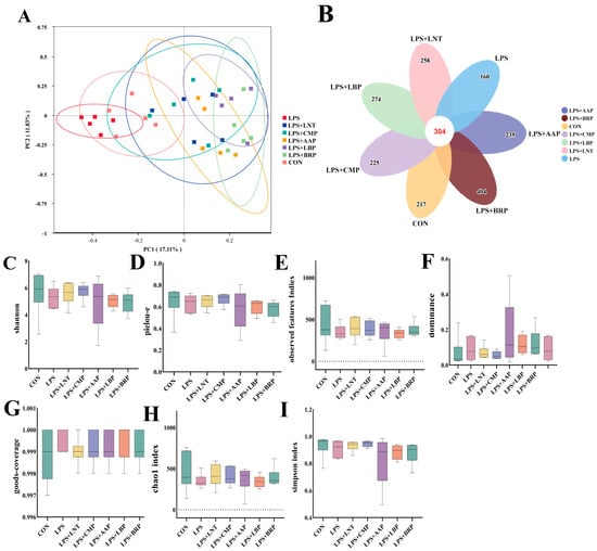The effects of different polysaccharides on the species diversity of the intestinal flora (n = 6). (A) PCoA plot, (B) Petal plot presents each group of OTUs, (C) shannon, (D) pielou_e, (E) observed features, (F) dominance, (G) good_coverage, (H) chao1, (I) simpson.