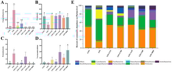 Effects of various polysaccharides on the intestinal microbiota at the phylum level (n = 6): (A) Campylobacterota, (B) Firmicutes, (C) Proteobacteria, and (D) Verrucomicrobiota, and (E) The role of polysaccharides in regulating the structure of intestinal microbiota at the phylum level. ∆ p < 0.05, ∆∆ p < 0.01, relative to the CON group. * p < 0.05, ** p < 0.01, relative to the LPS group.