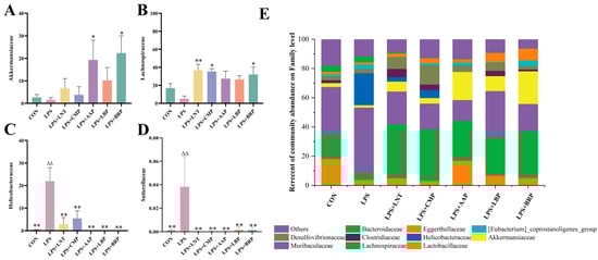 Effects of various polysaccharides on the intestinal microbiota at the family level (n = 6): (A) Akkermansiaceae, (B) Lachnospiraceae, (C) Helicobacteraceae, and (D) Sutterellaceae, and (E) The role of polysaccharides in regulating the structure of intestinal flora at the genus level. ∆∆ p < 0.01, relative to the CON group. * p < 0.05, ** p < 0.01, relative to the LPS group.
