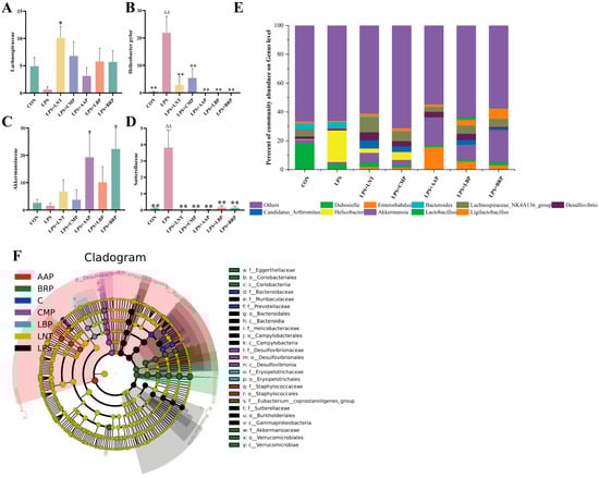 Effects of various polysaccharides on the intestinal microbiota at the genus level (n = 6): (A) Lachnospiraceae, (B) Helicobacteraceaei, (C) Akkermansia, and (D) Sutterellaceae; (E) The role of polysaccharides in regulating the genus-level structure of intestinal microbiota; and (F) LEfSe analysis. ∆∆ p < 0.01, relative to the CON group. * p < 0.05, ** p < 0.01, relative to the LPS group.