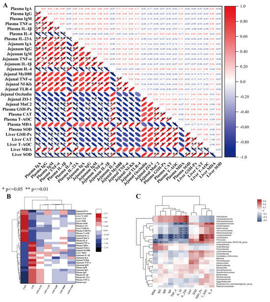 Heat map of the results of correlation analysis: (A) Correlation analysis of inflammatory factors, antioxidants, and intestinal barrier related indicators; (B) Inter-group cluster analysis of inflammatory factors, antioxidants, and intestinal barrier-related indicators; (C) Cluster analysis of plasma inflammatory factors, antioxidant indicators, and intestinal flora. Red signifies positive correlation, with intensity proportional to depth (deeper red indicating stronger positive correlation); blue denotes negative correlation, with intensity similarly proportional to depth (deeper blue indicating stronger negative correlation). * p < 0.05, ** p < 0.01.