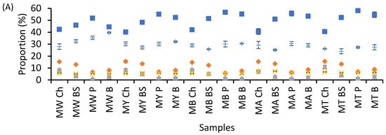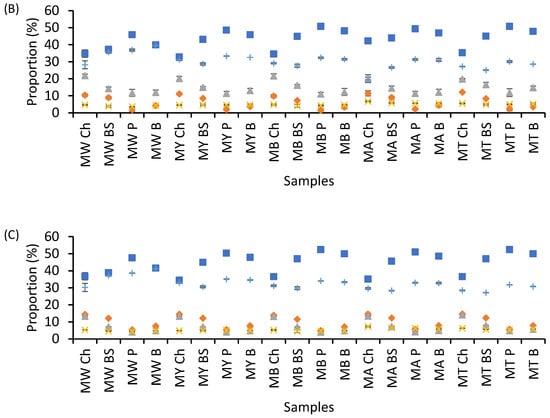 Chemical composition of taco samples across three processing methods: (A) Plain, (B) Full-Fat, (C) Patted-Dry. Each data point represents the mean of triplicate samples. Symbols represent individual chemical components: ■ Moisture, ◆ Protein, ▲ Lipids, ✕ Ash, + Carbohydrates (Calculated by difference). MW: Maseca White, MY: Maseca Yellow, MB: Maseca Blue, MA: Maseca Antojitos, MT: Maseca Tamal. Fillings: Ch—Chicharrón, BS—Beef Skirt, P—Potato, B—Bean.