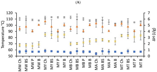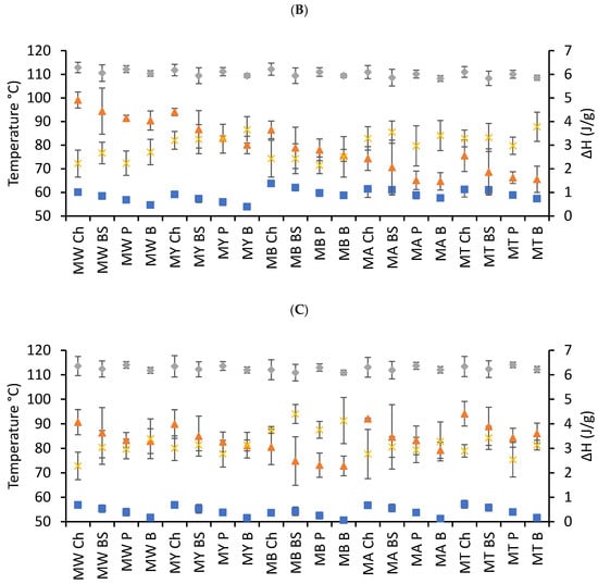 Selected thermal characteristics of tacos. (A) Plain, (B) Full-Fat, (C) Patted-Dry. Tp (■), Tp AL (◆), ΔH (▲), ΔH AL (✕). MW: Maseca White, MY: Maseca Yellow, MB: Maseca Blue, MA: Maseca Antojitos, MT: Maseca Tamal. Ch: Chicharron, BS: Beef Skirt, P: Potato, B: Bean.