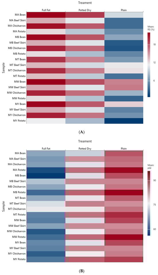 Figure 3 presents the resistant starch (RS) content and predicted glycemic index (pGI) of taco samples as affected by processing treatment (Full-Fat, Patted-Dry, and Plain) and filler type. The RS data (Figure 3A) reveal a clear inverse pattern relative to fat removal: tacos subjected to the Plain condition (i.e., fat not retained after frying) exhibited the highest RS values, particularly in samples filled with potato, beans, or other starchy fillers [23,32]. This observation suggests that the removal of surface fat may favor retrogradation or limit the extent of starch–lipid complexation, thereby increasing the formation or preservation of type 3 retrograded starch (RS). In contrast, Full-Fat and Patted-Dry treatments generally resulted in lower RS values, especially in animal protein-filled tacos (e.g., beef skirt, chicharrón), possibly due to the formation of amylose–lipid complexes that hinder retrogradation but simultaneously slow starch digestibility [9,10]. Interestingly, the RS levels remained relatively stable across flour matrices, indicating that filler and fat interaction play a more decisive role in modulating RS content than the tortilla base alone.