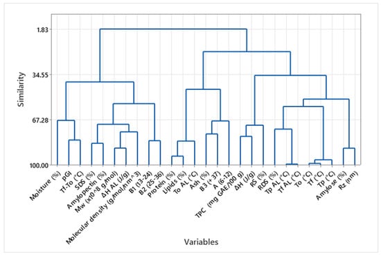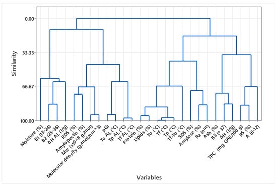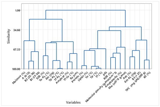 Figure 4 shows a hierarchical cluster analysis (HCA) performed on the complete set of variables measured in Plain taco samples. This analysis offers insights into the relationships among chemical composition, thermal properties, and functional indicators, including the glycemic index and starch digestibility. The dendrogram reveals three main clusters, highlighting meaningful groupings of related variables. On the left side, the first major cluster groups moisture content, resistant starch (RS), and TP, To. This association suggests that higher moisture may support greater starch retrogradation or reduced digestibility, aligning with the observed increase in RS under Plain conditions. It also implies that moisture plays a role in shifting gelatinization behavior, likely through its influence on starch-water interactions [23].