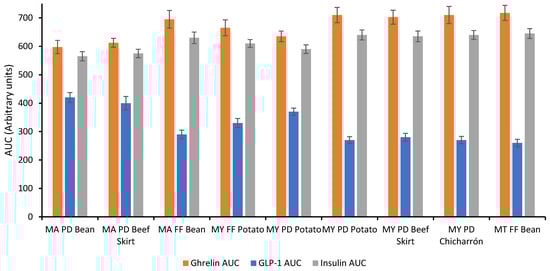 Postprandial Hormonal Responses to Taco Formulations with Varying Fat Treatments and Fillings. MY: Maseca Yellow, MA: Maseca Antojitos, MT: Maseca Tamal. P: Plain taco, FF: Full Fat, PD: Patted-Dry.