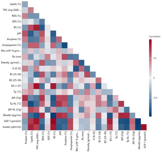 Pearson correlation matrix showing pairwise relationships among chemical composition, starch structure, thermal transitions, and postprandial hormone responses across taco samples. Legend note: Red indicates positive correlations, while blue indicates negative correlations; the stronger the color intensity, the higher the correlation magnitude. Abbreviations: RDS—rapidly digestible starch, SDS—slowly digestible starch, RS—resistant starch, pGI: Predicted glycemic index, TPC—total phenolic content, Mw—molecular weight, Rz—hydrodynamic radius, Tp—gelatinization peak temperature, Tp AL—amylose–lipid complex transition temperature, ΔH—gelatinization enthalpy, ΔH AL—amylose–lipid complex enthalpy.