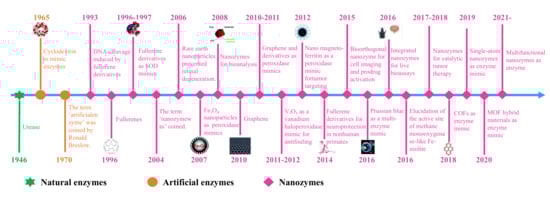Back in 2004, Manea proposed the professional term “nanozyme”, who applied organic ligands to modify gold nanoparticles (AuNPs), and then complexed with Zn2+ to prepare nanostructures with ribonuclease-like activity for cleaving phosphate esters [28]. Since the discovery of magnetic Fe3O4 nanoparticles with similar functions as horseradish peroxidase in 2007 [29], the development of nanostructures with natural enzyme-like properties has emerged as a pivotal field [30,31]. In 2013, Wei’s group summarized the nanomaterials with catalytic activity and also gave a specific definition of nanozymes. The development timeline of nanozymes is shown in Figure 1. Thus far, it is found that nanozymes exhibit diversified enzyme-like characteristics, mainly including catalase, oxidase, peroxidase, superoxide dismutase, etc. [32,33,34,35]. According to the structural compositions, the reported nanozymes can be roughly divided into noble metals (e.g., Au, Ag, Pt, Pd), metal oxides (e.g., Fe3O4, CeO2, ZnO, CuO), carbon-based nanostructures (e.g., carbon nanotubes, graphene oxide, and carbon dots), metal–organic frameworks (MOFs), and covalent–organic frameworks (COFs) [36,37,38,39].