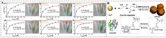 Catalytic kinetic activity of MOFs toward substrates: (A) Schematic diagram (Catalytic kinetic activity of ZiF-67 (a,d), unwashed MIP@MOF (b,e), washed MIP@MOF (c,f) as the substrates) [70] and (B) Mechanism diagram [69].