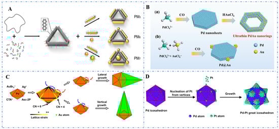 (A) Gold nanoparticle assembly guided by DNA origami templates [89]; (B) Etching to synthesize Pt nanocubes: (a) Schematic illustration for the growth process of PdAuNRs and (b) the compared route for other PdAu nanostructure [90]; (C) Selective deposition to form Pd-Au bimetallic nanocrystals [91]; (D) Electrochemical directional opportunity to form three-dimensional rhodium nanoframeworks [93].