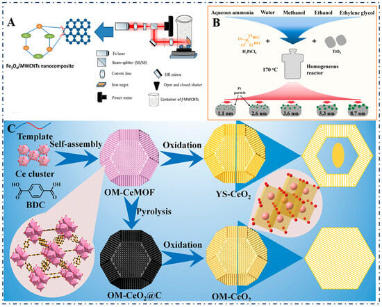 (A) Synthesis of Fe3O4 nanoparticles by pulsed laser ablation [111]; (B) Synthesis of Pt/TiO2 nanoparticles by hydrothermal/solvothermal method [113]; (C) Synthesis of OM-CeO2@C nanozymes by pyrolysis of MOFs precursors [114].