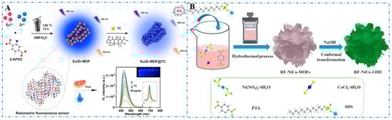(A) Eu/Zr-MOF@TC [163] and (B) RF-Nico-LDH [164] synthesized by the hydrothermal method.