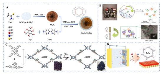 (A) Synthesis of In2S3/TpBpy COFs by solvothermal method [177]; (B) Synthesis of COFs at room temperature by ball milling [178]; (C) Preparation of ultrathin COF films by liquid–liquid interfacial self-assembly [179]; (D) Synthesis of photoresponsive COFs [180].