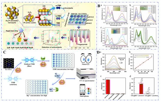 (A) Schematic diagram of antioxidant detection using Au2Pt bimetallic nanozyme arrays [219]; (B) Practical detection of pesticides using the inhibitory/enhancing effects of Pt NPs nanozymes (UV–vis absorbance spectra of the TMB-Pt NPs chromogenic system under different conditions for figures a, b, c, and d) [220]; (C) Schematic diagram of pesticide detection using the inhibitory/enhancing effects of Pt NPs nanozymes [221]; (D) Practical detection of organophosphorus pesticides using CeO2@NC nanozymes ((a) UV/Vis spectra change with various concentrations of paraoxon. (b) Standard curve for paraoxon detection. (c) Comparison of UV absorbance of different pesticides.(d) UV absorbance of paraoxon and parathion) [223].