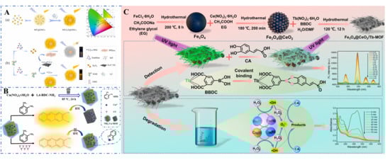 - Liao, X.; Li, B.; Wang, L.; Chen, Y. Boric acid functionalized Fe3O4@CeO2/Tb-MOF as a luminescent nanozyme for fluorescence detection and degradation of caffeic acid. Biosens. Bioelectron. 2024, 264, 116637. [Google Scholar] [CrossRef]