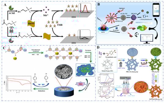 (A) Detection of organophosphorus pesticides using MnO2 nanosheet-based homogeneous electrochemical sensors [251]; (B) Construction of smartphone-assisted dual-mode biosensors using SA-Fe-NZ [253]; (C) Detection of p-nitrophenol using Ni-NCs/PEI composites [254]; (D) Detection of hydrazine by electrodepositing gold nanoparticles on MIL-53 (Fe, Ni) MOF-derived nanostructures [255].