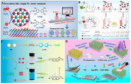Xi et al. (2023) developed iron single atoms (Fe-SA/Ti3C2Tx) with intrinsic peroxidase-like activity loaded on Ti3C2Tx (Figure 10A) and further constructed a sensitive Raman sensor array for the detection of five antioxidants, achieving satisfactory signal amplification performance. By utilizing the blocking effect of radical reactions and its highly recognizable catalytic characteristics, it can simultaneously identify antioxidants, including ascorbic acid, uric acid, glutathione, melatonin, and tea polyphenols [272]. Chen et al. (2025) synthesized a dual-mode paper sensor based on AuNPs and 4-mercaptopyridine for rapid and ultrasensitive detection of Hg2+ in tea. The sensor combined SERS technology with a silver shell grown in situ on the surface of AuNPs to significantly enhance signal intensity (Figure 10B). The detection limit of SERS was 0.48 pM, which is 500 times lower than that of traditional methods [273]. Xu et al. (2022) designed a novel SERS detection method for Cr (VI) detection through the catalytic oxidation of TMB by bifunctional (−)AuNPs (Figure 10C). The detection exhibited excellent selectivity with a detection limit as low as 0.4 nM [274]. Shaikh et al. (2023) synthesized silver nanostructures (Ag@Ch) loaded on a corrugated chitosan matrix for highly sensitive SERS detection of methylene blue, crystal violet, and p-nitrophenol [275]. Zhu et al. (2023) prepared Ag/ZnO nanorods on a PDMS film by mimicking the nanorod array on the surface of a dragonfly wing (Figure 10D). By combining semiconductor photoinduction and bionic nanostructures, the visualization and quantitative analysis of plastic microparticles were achieved, with the generated PIERS enhancement ratio being 11.3 times higher than that of normal SERS [276].