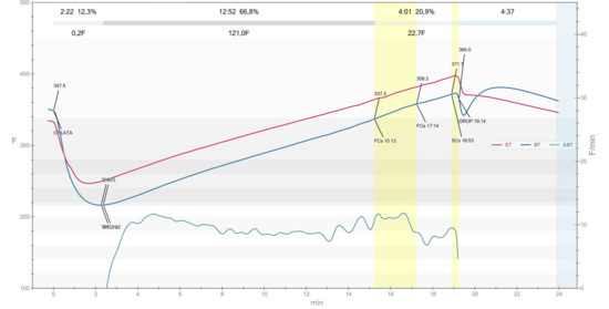 The roasting curve of the process by which RCSS used in the study was obtained. The designation ET stands for environment temperature, while BT refers to bean temperature. The point marked as “DROP” on the graph indicates the moment when roasting is completed by removing the beans from the roaster.