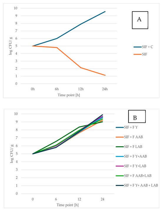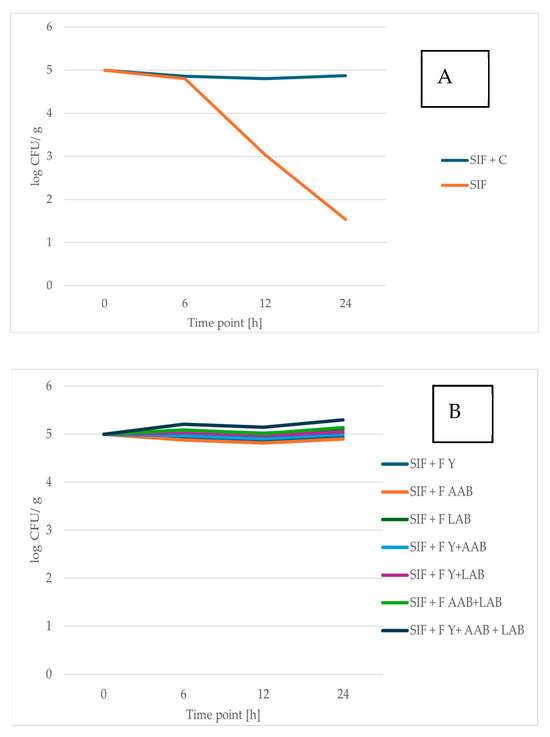 The viability of the single strain in SIF decreases notably after 6 h of incubation. While the RCSS formulation supports the survival of the tested strains, the symbiotic microbial consortium F Y + AAB + LAB demonstrates the most pronounced protective effect, resulting in the highest viable cell count. Fermentation processes altered the chemical composition of RCSS, enhancing the availability of certain growth-promoting compounds. Notably, supplementation with RCSS fermented by Y + LAB or Y + LAB + AAB led to significantly higher counts of S. boulardii after 24 h of incubation. The greatest increase in the number of L. brevis cells was observed in SIF enriched with RCSS fermented using the consortium of Y + AAB + LAB.