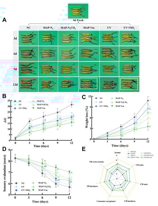 Changes in C. sinensis’s apparent quality: including (A) color quality, (B) color difference, (C) weight loss, (D) sensory evaluation, and (E) differences in sensory attribute ratings. The vertical bar represents the SDs of replicates; different letters indicate significant differences between treatment groups. Note: NC: negative control group; UV: ultraviolet light irradiation; UV + TiO2: photocatalysis as ultraviolet light irradiated with the presence of TiO2; MAP-N2: modified atmosphere packaging with 100% N2; MAP-N2CO2: modified atmosphere packaging with 80% N2 and 20% CO2; and MAP-Vac: vacuum packaging sealed with air moved.