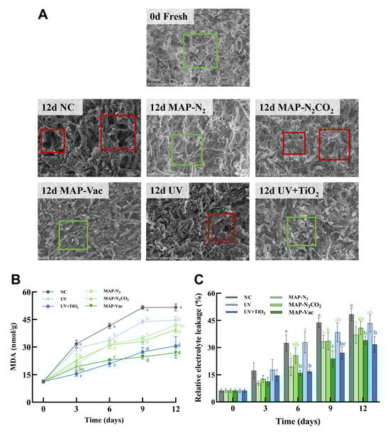 Figure 3B illustrates the variations in the malondialdehyde (MDA) content, a byproduct of the lipid peroxidation of cell membrane lipids representing membrane rupture and the loss of cell integrity; the elevated tendency is consistent with existing findings [4]. All five treatments exhibited MDA level inhibition compared to the NC group from day 6 (p < 0.05). Among these, the MAP-Vac and UV + TiO2 treatment demonstrated stable minimal MDA accumulation from day 6 (p < 0.05), demonstrating superior efficacy in mitigating oxidative stress and prolonging the storage quality of C. sinensis. SEM images (Figure 3A) further support that the cell structures in the MAP-Vac and UV + TiO2 were less damaged compared to in the NC group.