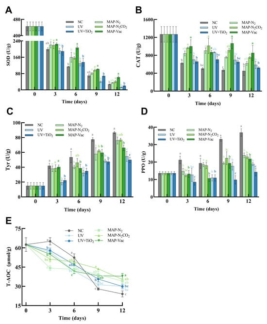 Changes in C. sinensis’s antioxidant capacity, including (A) SOD, (B) CAT, (C) Tyr, (D) PPO, and (E) T-AOC. The vertical bar represents the SDs of replicates; different letters indicate significant differences between treatment groups. Note: NC: negative control group; UV: ultraviolet light irradiation; UV + TiO2: photocatalysis as ultraviolet light irradiated with the presence of TiO2; MAP-N2: modified atmosphere packaging with 100% N2; MAP-N2CO2: modified atmosphere packaging with 80% N2 and 20% CO2; and MAP-Vac: vacuum packaging sealed with air moved.