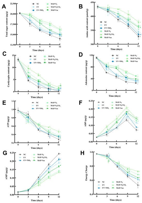 Changes in C. sinensis’s nutrients, including (A) total sugar content, (B) amino acid content, (C) cordycepin, (D) adenosine content, (E) ATP, (F) ADP, (G) AMP, and (H) energy charge. The vertical bar represents the SDs of replicates; different letters indicate significant differences between treatment groups. Note: NC: negative control group; UV: ultraviolet light irradiation; UV + TiO2: photocatalysis as ultraviolet light irradiated with the presence of TiO2; MAP-N2: modified atmosphere packaging with 100% N2; MAP-N2CO2: modified atmosphere packaging with 80% N2 and 20% CO2; and MAP-Vac: vacuum packaging sealed with air moved.