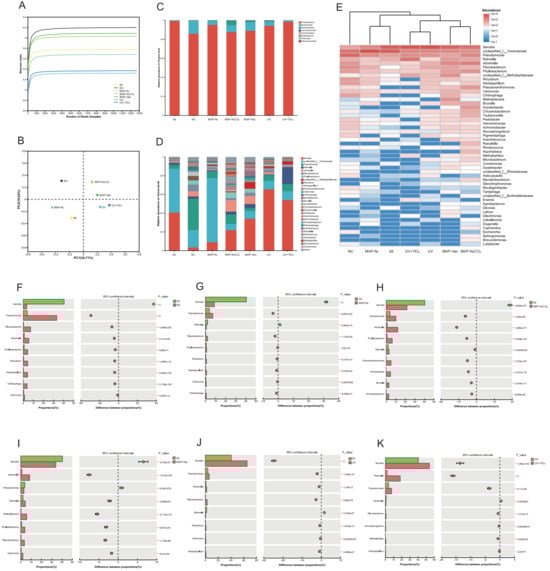 Changes in bacterial community: Shannon curves (A) and PCoA analysis (B) of different treatments of C. sinensis during chilled storage. Taxonomic distribution of bacterial communities at the phylum level (C) and genus level (D), and clustering heatmap at genus level (E). Fisher exact test bar plot of microorganisms at the genus level: 0 d vs. 12 d NC (F), 0 d vs. 12 d MAP-N2, (G), 0 d vs. 12 d MAP-N2CO2 (H), 0 d vs. 12 d MAP-Vac (I), 0 d vs. 12 d UV (J), and 0 d vs. 12 d UV + TiO2 (K). The 0 d represents fresh status at day 0 without chilled storage. Note: NC: negative control group; UV: ultraviolet light irradiation; UV + TiO2: photocatalysis as ultraviolet light irradiated with the presence of TiO2; MAP-N2: modified atmosphere packaging with 100% N2; MAP-N2CO2: modified atmosphere packaging with 80% N2 and 20% CO2; and MAP-Vac: vacuum packaging sealed with air moved.