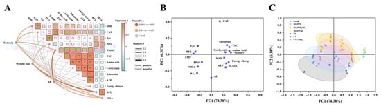 Principal component analysis (PCA) (Figure 7B,C) was performed to evaluate the effects of different preservation treatments on the quality of C. sinensis during chilled storage. The first two principal components (PC1 and PC2) explained 74.38% and 6.38% of the total variance, respectively. As shown in the loading plot (Figure 7B), several quality-related indices were closely linked to PC1. Parameters such as sensory score, total sugar content, adenosine, and amino acid content, which represent metabolism and apparent properties, exhibited a positive correlation with PC1, suggesting that these attributes were better maintained under optimal preservation conditions. Conversely, parameters including AMP, REL, PPO, and MDA showed negative correlations with PC1, implying that these markers of oxidative stress and metabolism degradation became more pronounced under suboptimal chilled treatments, potentially leading to quality degradation.