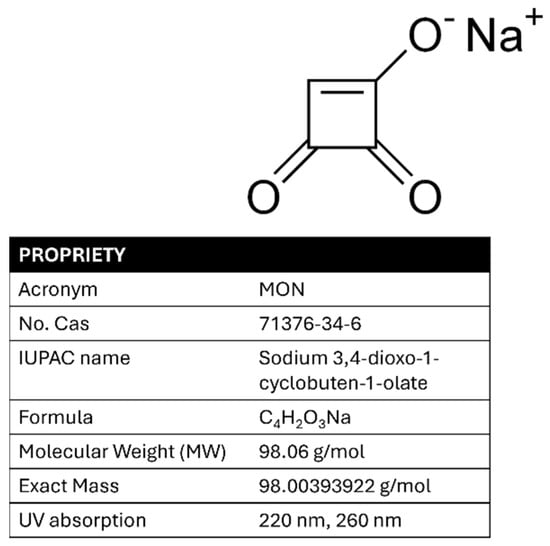 For chronic exposure, the EFSA was unable to derive a Tolerable Daily Intake (TDI) due to a lack of sufficient long-term toxicity data. Nevertheless, haematotoxicity—observed as reductions in hematocrit and hemoglobin levels in a pig study—was identified as the key chronic effect. A Benchmark Dose Lower Confidence Limit for a 5% response (BMDL05) of 0.20 mg/kg bw/day was established as the reference point for chronic human exposure [19]. In addition, the lack of toxicokinetic data complicates both risk assessment and regulatory decision-making. Improved data collection, particularly on MON occurrence in cereals such as maize, is needed to support comprehensive human health risk assessments. Validated analytical methods for detecting MON are limited, highlighting the difficulty of implementing monitoring campaigns and official controls to ensure food safety. The analysis of MON differs significantly from that of other mycotoxins commonly found in maize flour as it is a small (MW: 98.06 g/mol), highly polar, and strongly acidic molecule (pKa approximately 1.7), making its determination particularly challenging. Unlike most of the well-analyzed mycotoxins (classical or emerging), which are soluble in most organic solvents, MON is highly soluble in water due to its polarity and exhibits limited solubility in other common polar solvents, such as acetonitrile and methanol. It is present in nature as sodium or potassium salt; however, water cannot be considered as an ideal extraction solvent as it often co-extracts numerous unwanted matrix components, even when ion-pairing reagents are used [20]. Therefore, a mixture of extraction solvents is generally preferred [21]. Its ultraviolet spectrum shows two characteristic absorption bands at approximately 260 nm and 230 nm, and it decomposes at 345–355 °C [22]. The structure, chemical name, acronym, physicochemical properties, and maximum UV absorption of MON are shown in Figure 1.