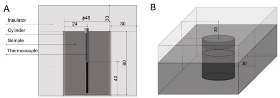 The temperature change over time was measured under Rayleigh–Bénard convection conditions by heating only the bottom and insulating from external factors (Figure 1). The chamber was a polypropylene cylinder with a diameter of 4.8 cm and a height of 8 cm. The sample was then filled to 140 g. For the temperature measurements, T-type thermocouples were positioned at the center of the cylinder at heights of 1 cm, 4 cm, and 8 cm from the base. The cylinder was insulated with a 3 cm-thick layer of XPS. The cylinder was preheated to 30 °C in a water bath (WB-22, DAIHAN Scientific, Wonju, Republic of Korea) and then placed in a 40 °C water bath (SSB-45, DAIHAN Scientific, Wonju, Republic of Korea). Temperature was recorded using a data logger (MX100; Yokogawa, Tokyo, Japan).