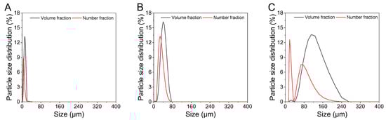 Particle size distribution curves of stearic acid suspension ((A): 120, (B): 31, (C): 10) measured using a laser diffraction spectrometer analyzer. The labels 120, 31, and 10 refer to the average particle size rounded to one decimal place.