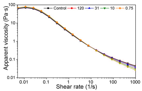 The change in apparent viscosity with shear rate for the suspensions and control is shown in Figure 3. All samples, including the control, exhibited shear-thinning behavior. At a low shear rate (below 17/s), the control exhibited the lowest apparent viscosity, while suspension with smaller particles demonstrated higher viscosities. As the shear-thinning effect intensified with smaller particles, the order of apparent viscosity above 87/s changed to 0.75, 10, 31, 120, and control.
