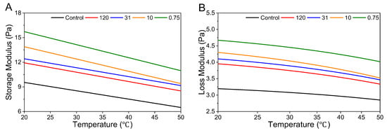 In Figure 4, both G′ and G″ decreased with increasing temperature for all samples, reflecting the thermal softening behavior typical of viscoelastic fluids. The control sample, which lacked stearic acid particles, exhibited the lowest moduli across the temperature range. In contrast, stearic acid-containing suspensions showed higher G′ and G″ values, with the moduli increasing with particle size. This can be attributed to the filler effect of stearic acid particles, which reinforce the particle–medium network and enhance structural integrity. The temperature-induced decline in both moduli is likely due to the reduced viscosity and weakened molecular entanglements of the continuous phase (xanthan gum solution), resulting from increased molecular mobility. Larger particle sizes resulted in higher G′ and G″ values, likely due to increased particle–particle interactions and physical entanglements within the suspension network. These structural interactions facilitate greater energy storage and viscous dissipation during deformation. The relatively moderate changes in G′ and G″ with temperature are likely due to the high thermal stability of xanthan gum, which preserves its network structure even at elevated temperatures [33].