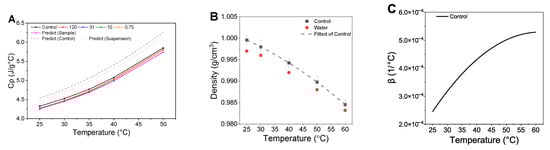 Specific heat capacity (A), density of the control (B), and thermal expansion coefficient of the control (C). Cp represents the specific heat capacity, and β represents the thermal expansion coefficient of the control. The labels 120, 31, and 10 correspond to the average particle sizes rounded to one decimal place, while 0.75 was rounded to three decimal places. Predict (control) indicates the predicted specific heat of the control using the equation by Muthamizhi et al. [34]. Predict (sample) refers to the predicted specific heat of the suspensions calculated using the rule of mixtures and measured specific heat of the control. Predict (suspension) represents the specific heat of the suspensions, calculated with the rule of mixtures using the predicted values of Predict (control).